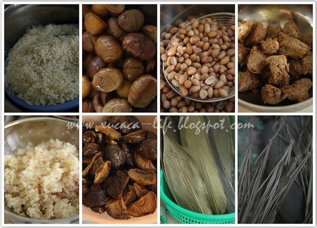 将一片粽叶,叶尾互叠,,曲折成漏斗型,舀入适量糯米,顺序放入肉块,眉豆,虾米,栗子和蘑菇,再铺上糯米,覆下粽叶,按下两侧,屈好余下的叶端,用咸水草绕扎好打结。以此类推,1公斤米,大约裹22个粽子。