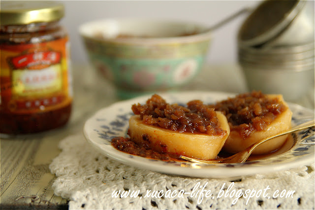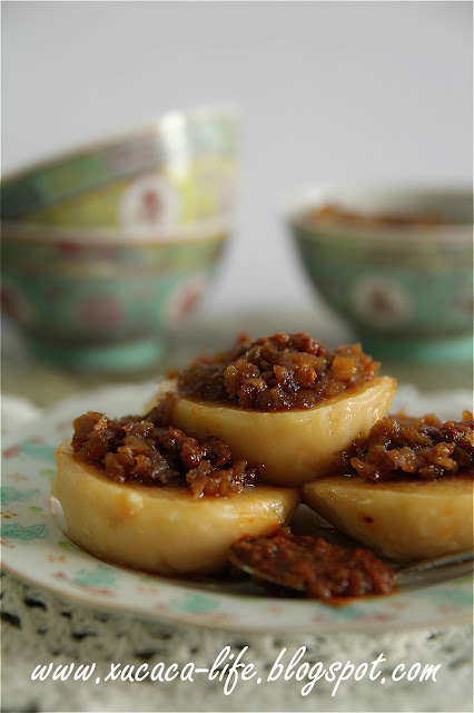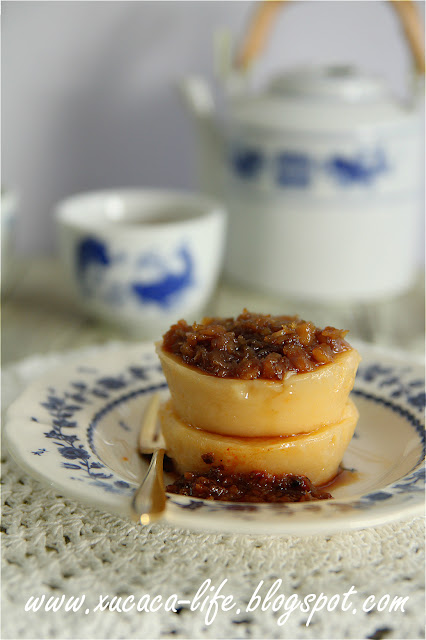 4)将适量的炒香菜蒲和椰糖酱放在南瓜碗仔糕上一起享用。