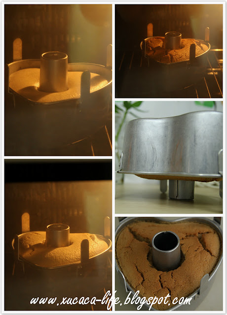 10) 蛋糕烘好后,立刻把蛋糕从烤箱里拿出倒扣,待冷后才脱模才享用。
