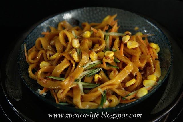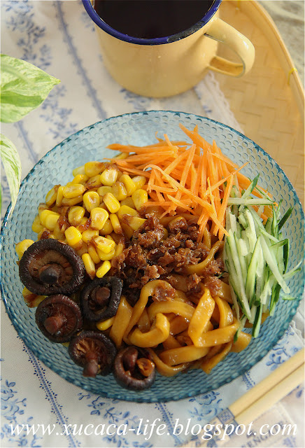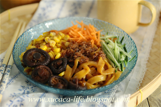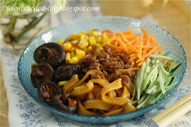 加入玉米粒、黄瓜、红萝卜丝拌面,很有口感。有嚼劲。