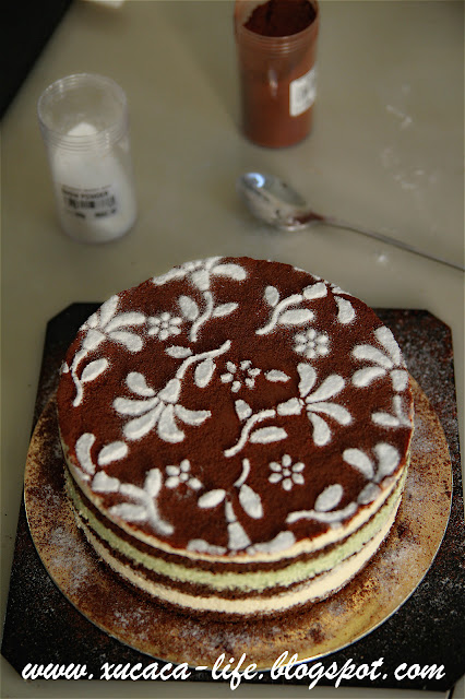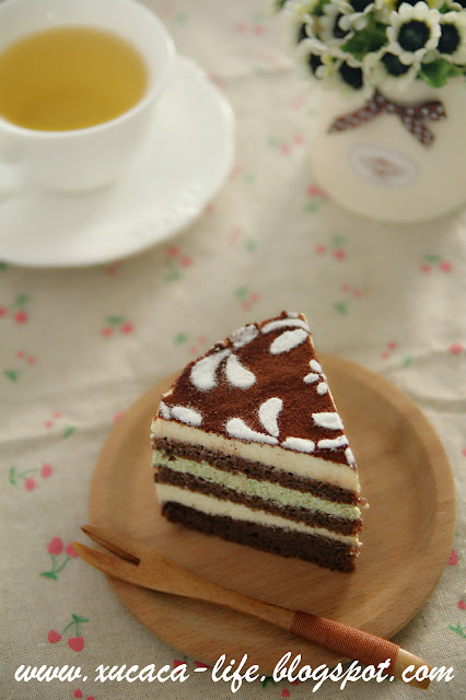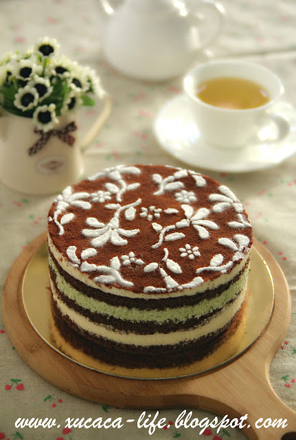 然后再叠上第二片蛋糕体。再涂上咖啡酒。把绿茶面糊倒入。
