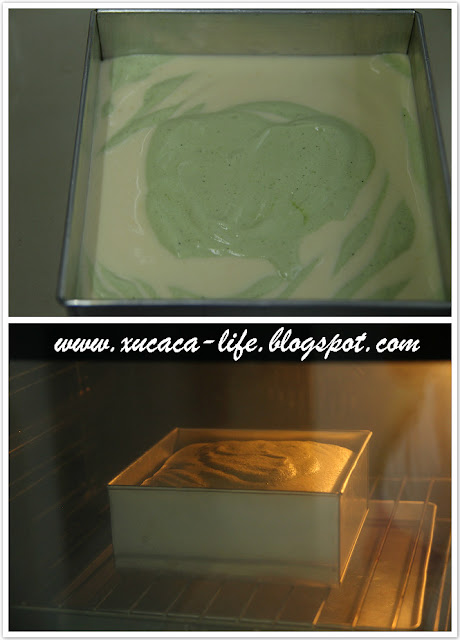 再叠入一大勾白色面糊,再叠上一大勾绿茶面糊。一绿、一白面糊重叠至面糊用完为止。
