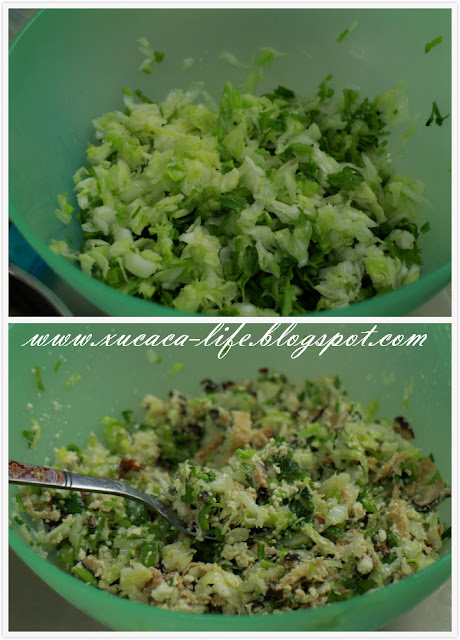 ** 把切丝的高丽菜加入盐巴,搅拌。放置休息一会儿。然后把高丽菜挤干水。只要收缩后的高丽菜。备用。(无需预先煮过)