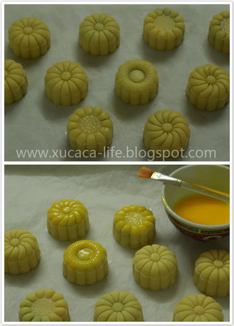 4)放入预热后的烤箱,以170度烘烤大约10分钟。然后取出烤箱,在月饼表层涂上蛋黄。(旁边无需涂)。