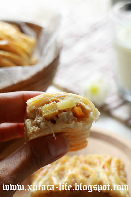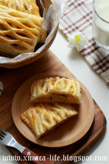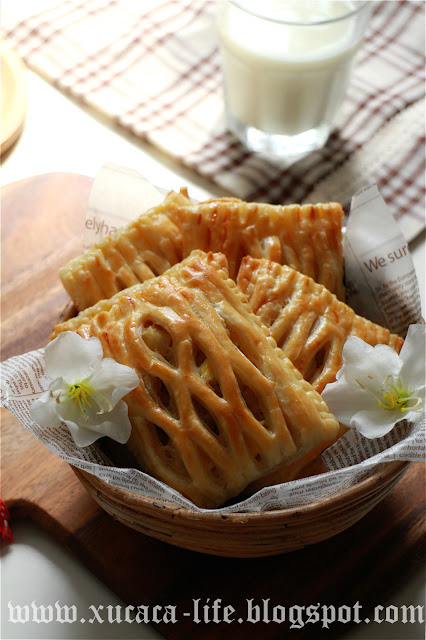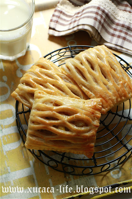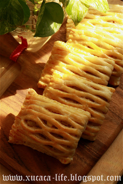 1)把馅料放在一片切成适度长形的 puff pastry 长。