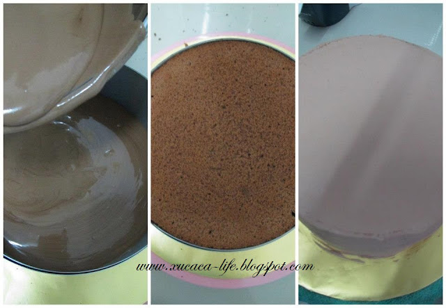 1) 把蛋糕体平均横切三片,在慕思模里放入一片巧克力蛋糕,再倒入巧可力慕思。
