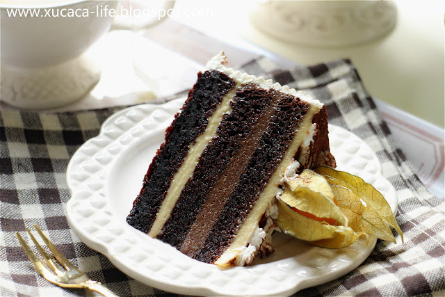 6)把魔鬼巧克力蛋糕体平均切成3片。芝司糊也一样分成3份。