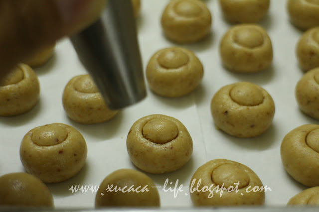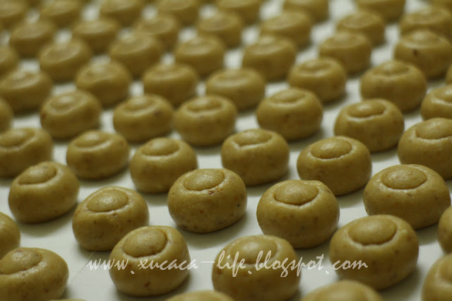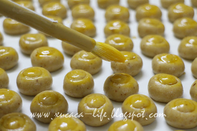 2)搓成圆粒状。表层涂上一层蛋黄液,放上杏仁片。