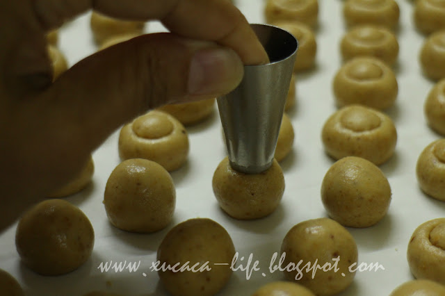 3)取适量的面团搓圆,再用适合的盖子印上圆性状。涂上蛋黄液。