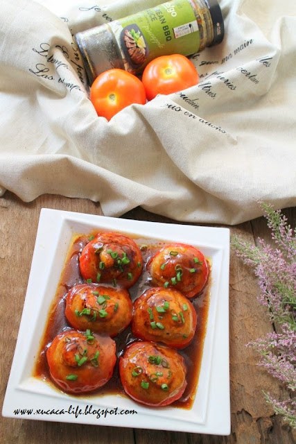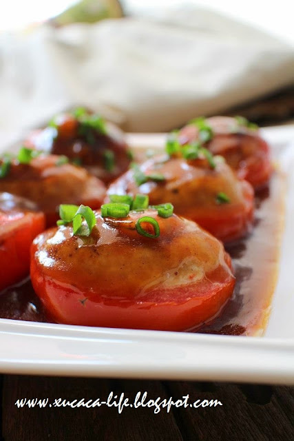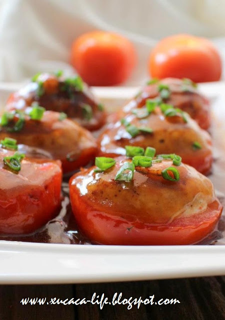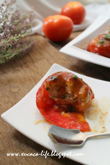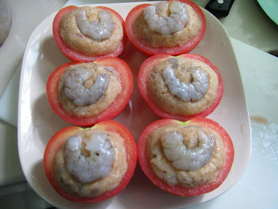 用汤匙把肉饺塞入挖了洞的番茄里。