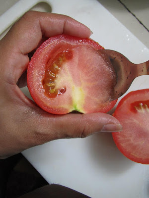 挖一个洞,把番茄里头的种子取出。