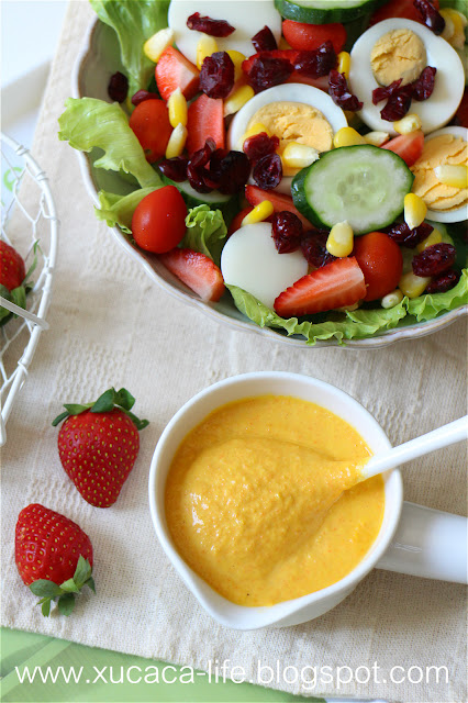 2)将这沙拉酱淋在或拌在蔬菜上就可享了。