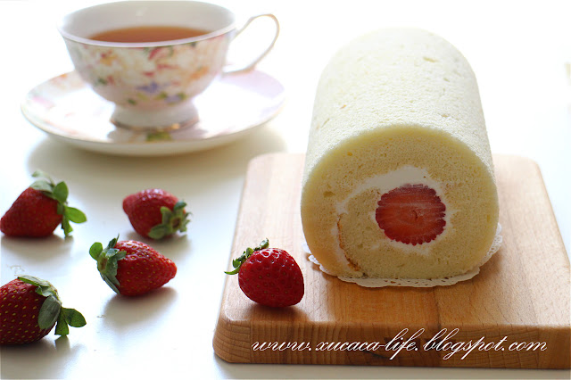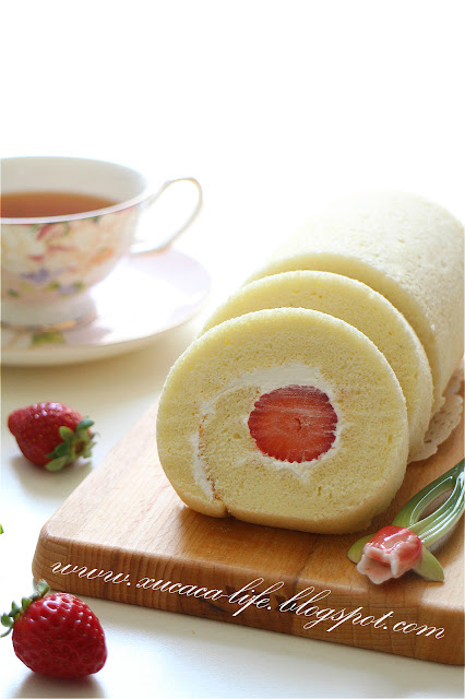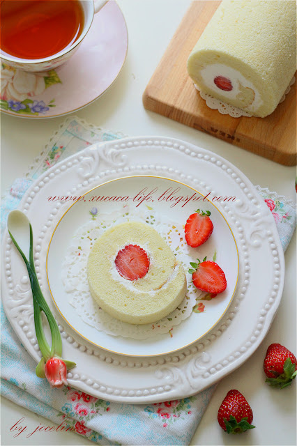 9。蛋糕卷好后,放入冰箱冷藏至少2个小时后,让蛋糕定型后才切开享用。