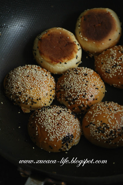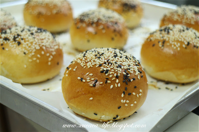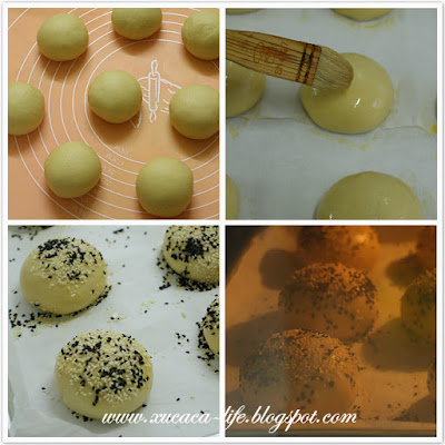 4) 让圆面团放置发酵大约45分钟。然后涂上蛋液。撒上适量的黑白芝麻粒。