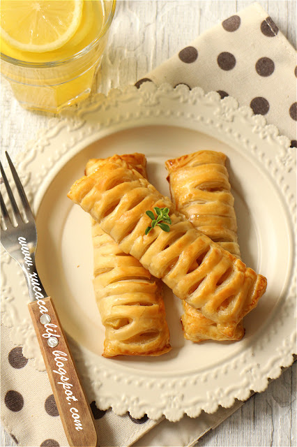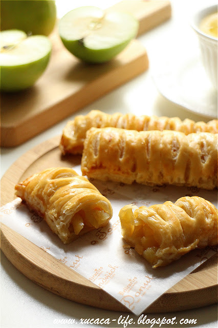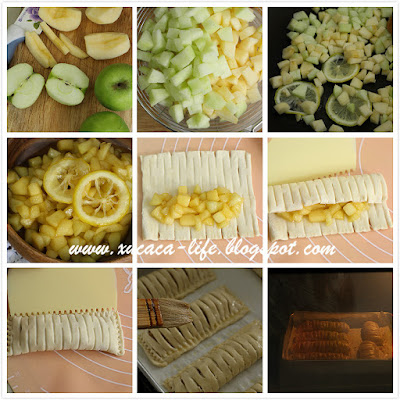 5)一张酥派皮,放上适量色苹果馅料,对折关平。把边压紧。