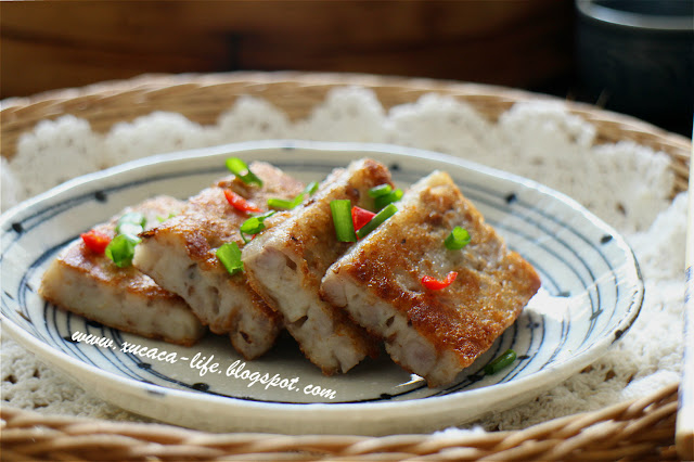 可以把芋头糕切片,放入锅子里煎香才享用。