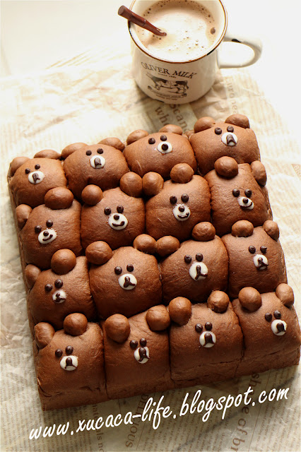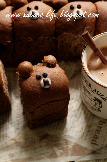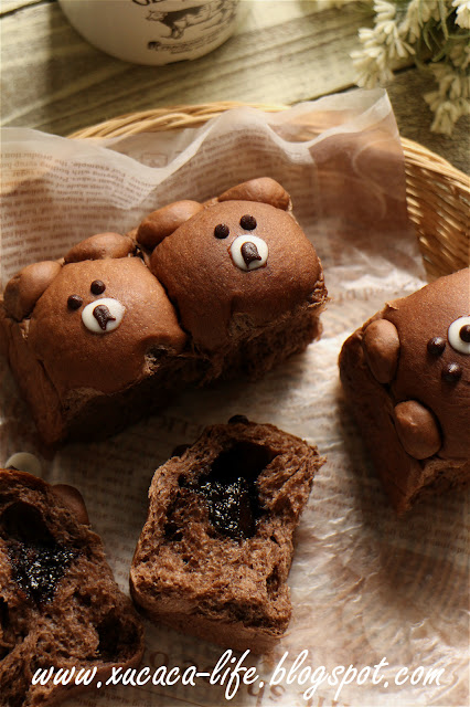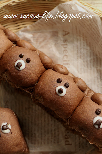 9)面包完全冷却后,再各把两色巧克力隔水溶化。放入挤花袋里挤出眼睛和嘴巴即可。