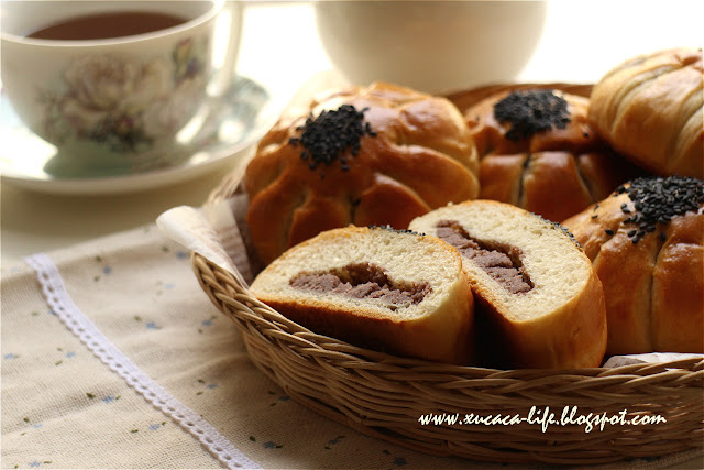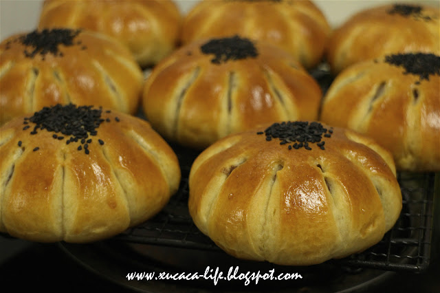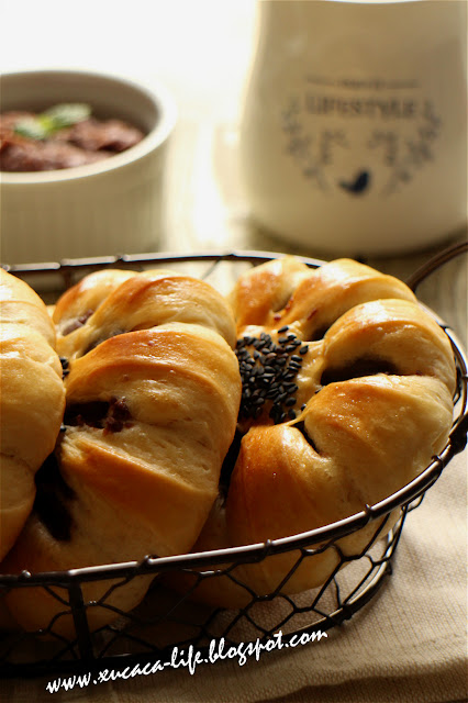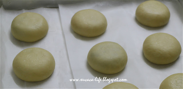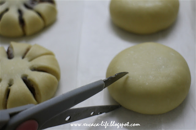 3)松弛10分钟后,用木棍杆平。再包入1大汤匙的红豆沙馅。排入铺了烤纸的烤盘里,稍微压平。