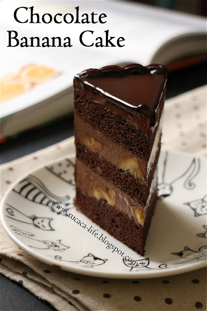 这天的巧克力香蕉蛋糕,煮了巧克力慕斯当夹心。