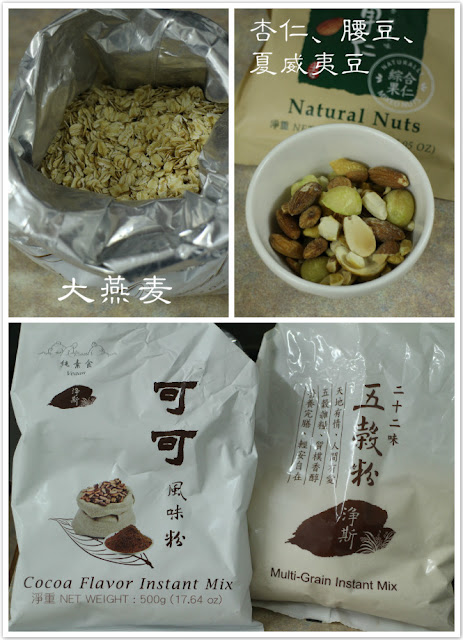 1)大燕麦(Oat)用搅拌器搅成燕麦粉。加入五谷粉、可可风味粉混合均匀。
