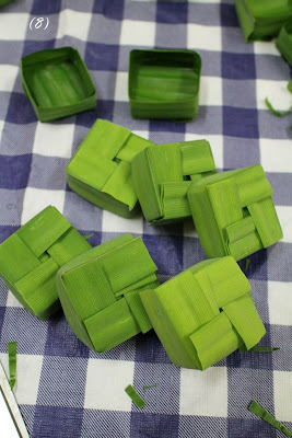 (6)如果中间有小洞,需要剪出四方斑兰叶子叠入盒子里。