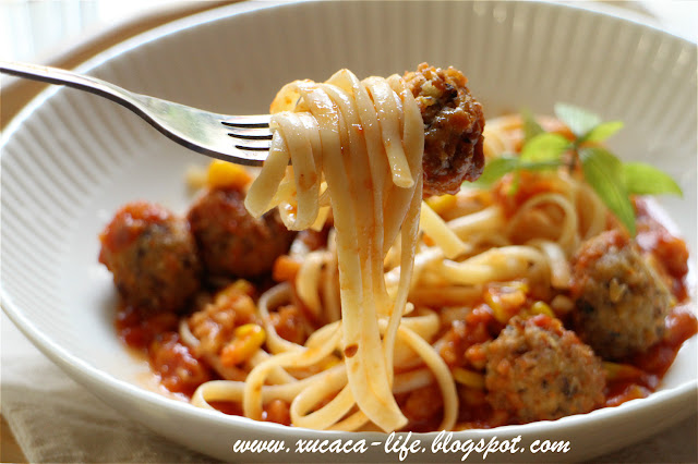 ** 加入自制番茄酱,蔬菜丸和撒上少许的香叶即可享用 **