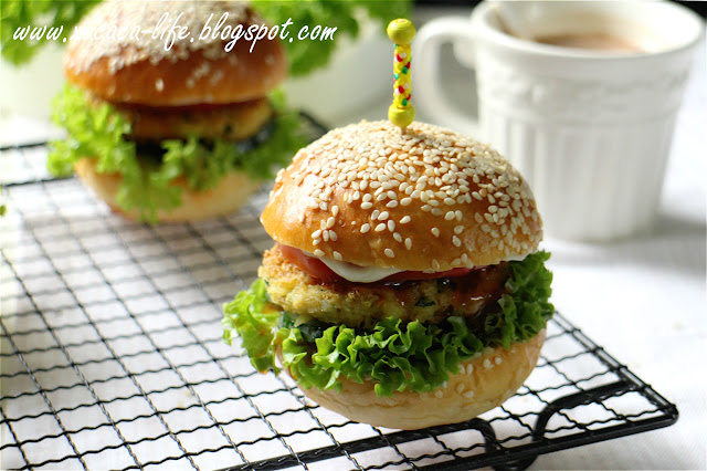 ** 汉堡夹心材料:自制蔬菜饼、红番茄、生菜、日本黄瓜、美乃芝、辣椒酱/番茄酱、芝士片 **