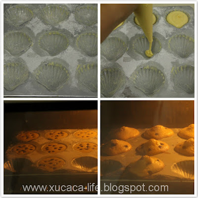 5)冰箱里的模型取出,面糊放入挤花袋里。把面糊挤在贝壳模型里7分满。