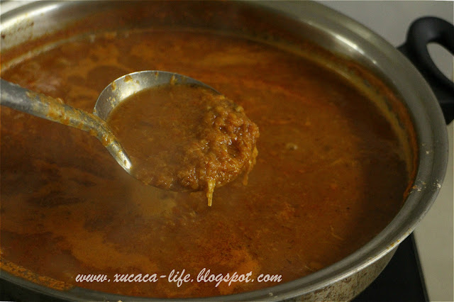 3)倒入2包AA1的Laksa酱料,搅拌均匀后,再添入700毫升或适量的清水一起煮开。