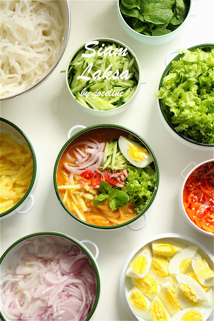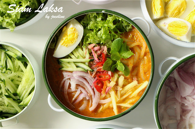 生菜(切丝)、薄荷叶、辣椒、拉沙花、水煮蛋、拉沙面条 或 泰式粗米粉