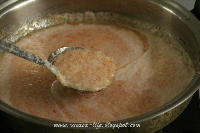 4)加入4大匙或适量的南瓜素松一起煮烂至滚。