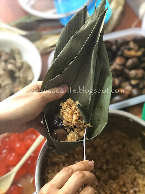 5)把锅加水煮滚,然后把裹好的粽子放入锅里,以大火蒸大约1小时或熟透即可。