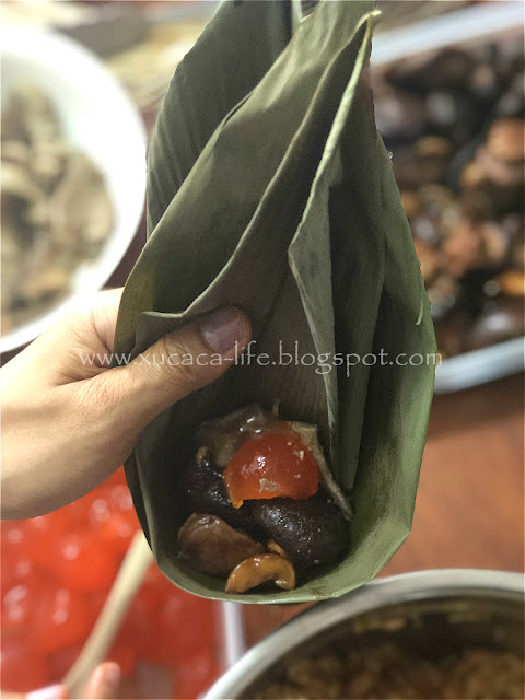 3)再放入适量的馅料(栗子、香菇、素肉、咸蛋黄),再填入糯米按平。