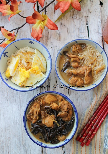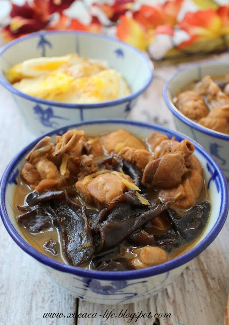 然后加入酒鸡锅里一起焖香。又或者搭配面线一起吃都可以。